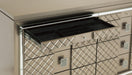 The striking design of the Loudon Collection presents as a bold statement of your glamorous inclinations. The champagne metallic finish of the dresser shimmers with additional sparkle coming in the form of the black glass encrusted drawer pulls, embossed diamond pattern of the mindy veneer, mirrored framing and acrylic feet. The top two drawers of the dresser feature hidden jewelry trays.