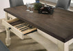 PLYMOUTH Counter Ht. Table, 60"L X 29 7/8"W X 37 3/4"H, 145.2lbs. Create a sense of comfort with this vintage ivory and dark gray table supported by turned legs. A sole storage drawer offers easy access to utensils, while the open bottom shelf is the perfect spot to display and conveniently store dinner wares. The matching bench and chairs are padded and upholstered in gray fabric, which offer a nice contrast to the lighter wood finish.